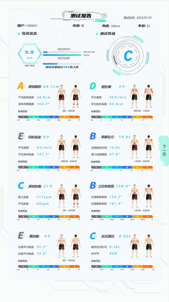 綜合體能測(cè)試:體能8項(xiàng)檢測(cè),反應(yīng)測(cè)試、原地跳躍、仰臥起坐、俯臥撐、高抬腿、立位體前屈、單腿站立、原地快跑。結(jié)合全新的數(shù)據(jù)算法,對(duì)各項(xiàng)測(cè)試進(jìn)行綜合評(píng)分,反映身體發(fā)展?fàn)顟B(tài),通過(guò)這些項(xiàng)目的測(cè)試評(píng)估身體的綜合體能情況。