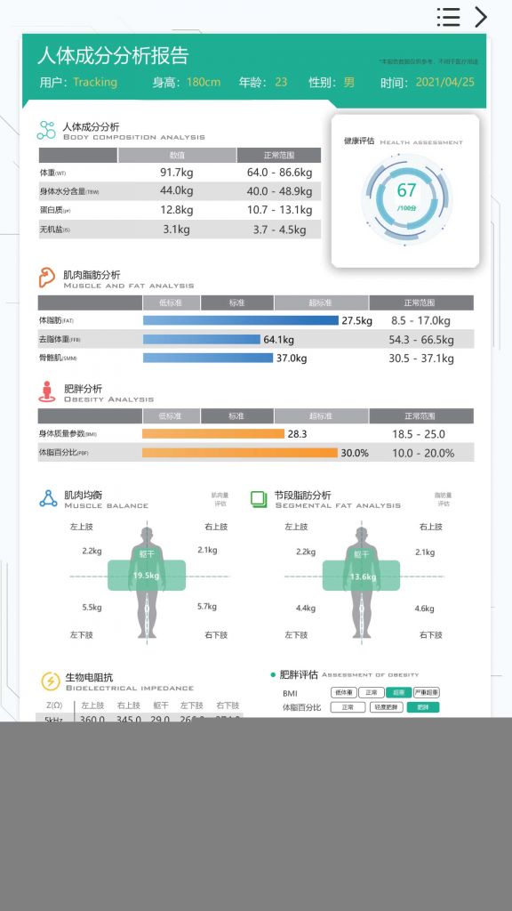 人體成分分析(選配):檢測(cè)人體基本組成成分:體重、骨骼肌、體脂百分比、體脂肪、蛋白質(zhì)、無(wú)機(jī)鹽、身體總水分、肥胖度、目標(biāo)體重、體重控制等多種數(shù)據(jù)。并通過(guò)優(yōu)化體成分分析融合算法提高體成分檢測(cè)的準(zhǔn)確度。