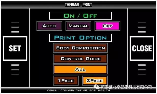 選擇BODY COMPOSITION則輸出人體成份分析、體形評(píng)估、各部位評(píng)估的結(jié)果,選擇CONTROL GUIDE,則輸出調(diào)節(jié)指南的結(jié)果。